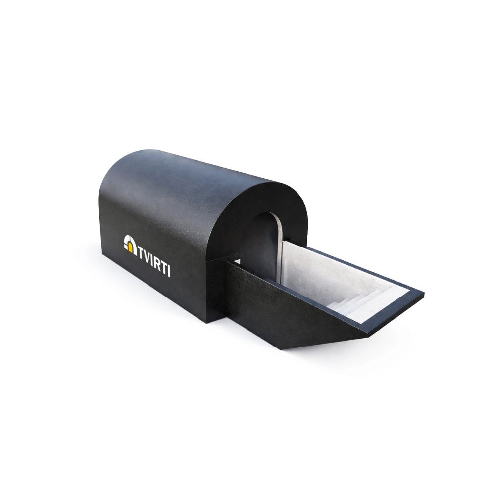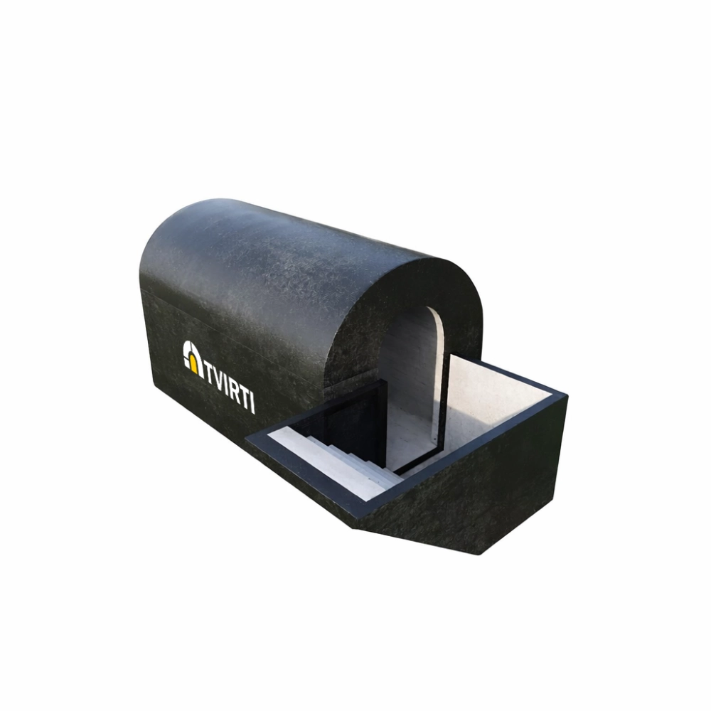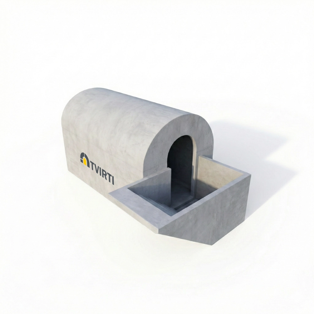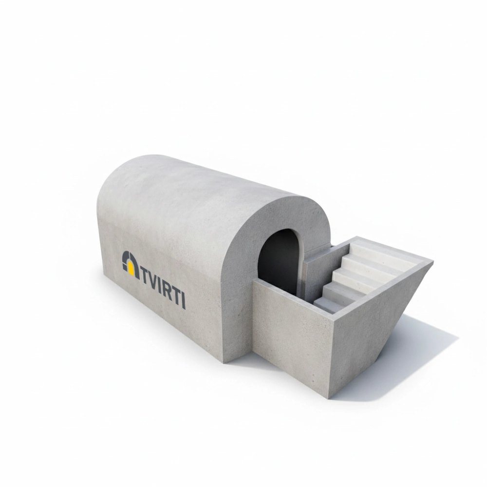 TVIRTI M6 – tai monolitinis gelžbetoninis rūsys su integruotais betoniniais laiptais, sukurtas patogiam ir saugiam naudojimui kasdien. Šis modelis skirtas įgilinimui į gruntą, o jo pagrindinis išskirtinumas – galimybė pasirinkti laiptų kryptį: tiesiai, į kairę arba į dešinę. Tai leidžia optimaliai pritaikyti rūsį prie sklypo plano, pastatų išdėstymo ar reljefo, įskaitant montavimą šlaite.